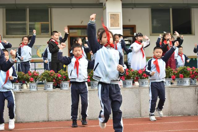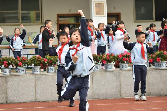 升旗仪式开始了,全体立正,升国旗,唱国歌,敬礼。同学们站得笔直,飞扬的五星红旗是心中的信仰,高举的少先队员右手是我们对祖国的崇敬,随着国旗向上凝望的眼神充满了对未来的希望。一首国歌唱响了少年与中国的力量。