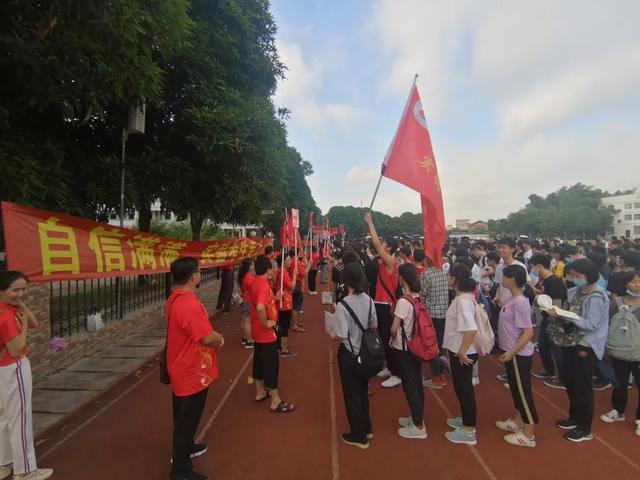 全体高三班主任及任课教师早早就集结在田径场,为高三学子们送考。老师身着寓意“开门红”的红色衣服为考生们加油、鼓劲,这成了校园里一道亮丽的风景线。他们始终面带微笑,与考生握手、拥抱,送上最温暖的鼓励,帮助考生消除紧张,自信应考。“笑一个!轻松应考,加油!”、“give me five”、“稳住,必赢!”一声声叮咛语短却情长。还有校园里悬挂的一条条催人奋进的横幅,老师们手上举着的一面面校旗、标语,都是对高三学子的真情鼓励和无限关爱。